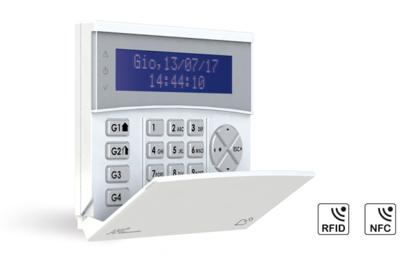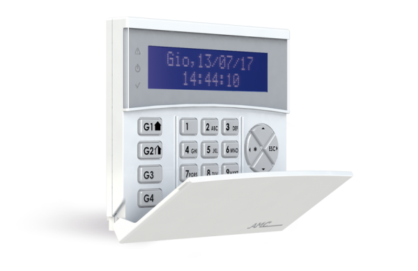 ManuelEN 50131 / GRADE 2 / CLASSE 2 Clavier LCD avec afficheur à cristaux liquides rétroéclairé à 32 caractères sur deux lignes. Deux lignes configurables indépendamment comme entrées ou comme sorties; 3 LED de signalisation. Volet de protection. Touches programmables pour saisie rapide. Dimensions: H 116, L 135, P 24 mm