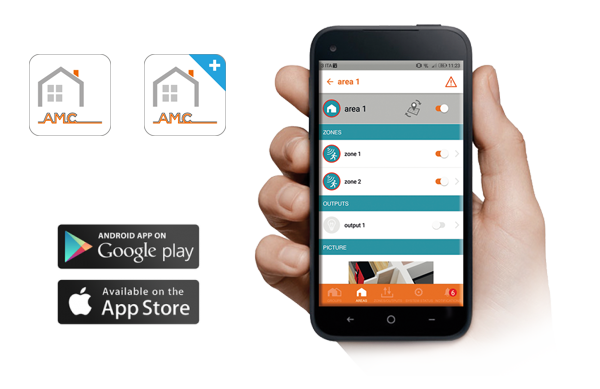 ManuelAppli AMC pour la gestion des centrales d’alarme, disponibles pour Apple et Android. - Graphiques mis à jour et améliorés - Importation de cartes graphiques pour chaque partition et groupe